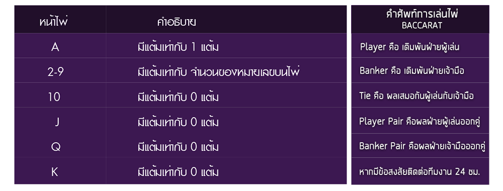 กติกาไพ่บาคาร่า จะมีการแจกไพ่โดยการหงายไพ่ 2 ใบทั้งฝ่ายผู้เล่นและฝ่ายเจ้ามือ ถ้าสองใบแรกได้ 1แต้ม ถึง 5แต้ม จั่ว , 6แต้ม หรือ 7แต้ม อยู่ , 8แต้ม หรือ 9แต้ม อยู่(แนชเชอรัล) ไม่ต้องจั่วไพ่อีกก็เหมือนกับการนับแต้มไพ่ป๊อกเด้ง ในไพ่บาคาร่าถือว่า 9 เป็นไพ่สูงสุด 6