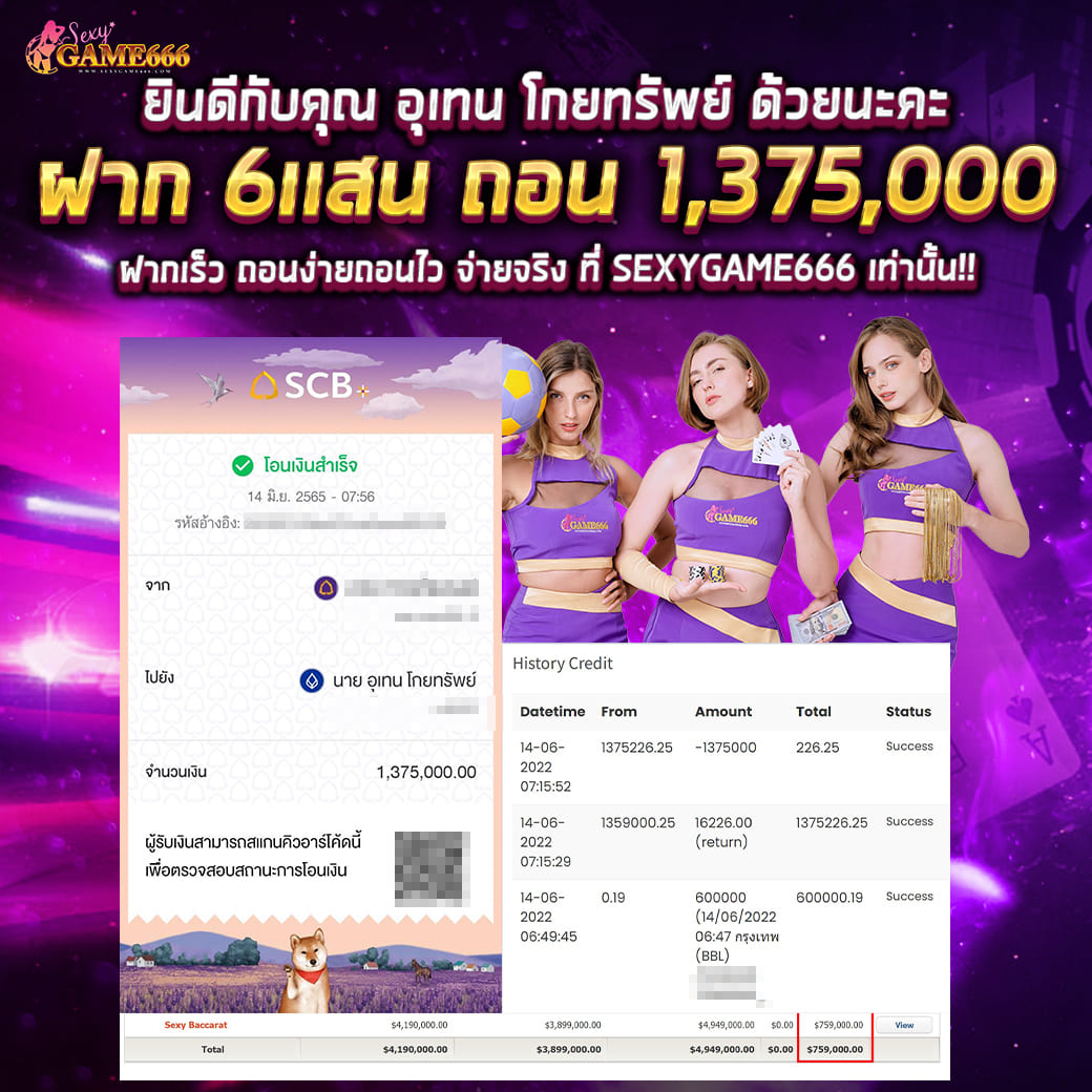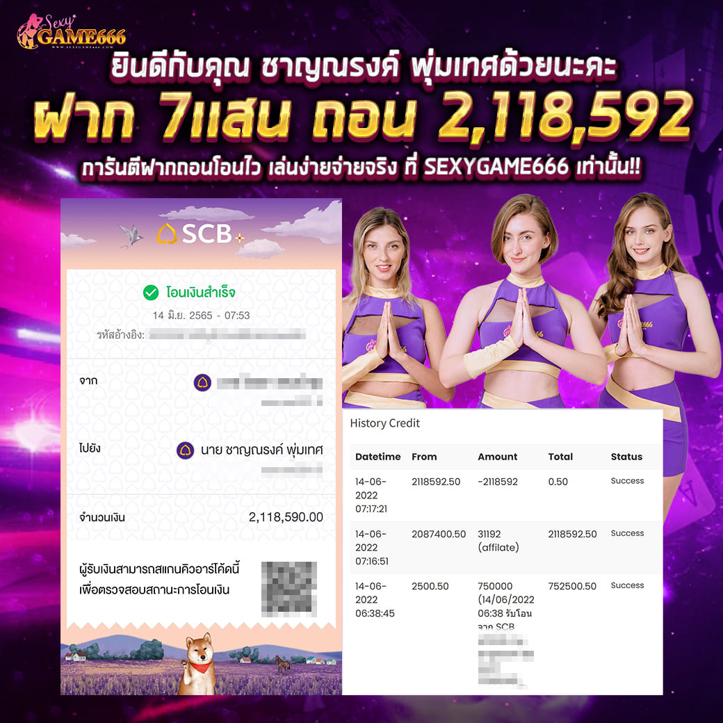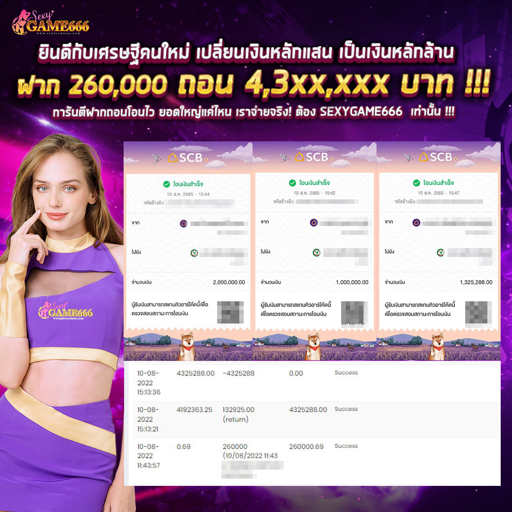 ด้วยการเป็น เว็บตรงไม่ผ่านเอเย่นต์ การทำธุรกรรมทั้งหมดใน SEXYGAME66 จึงควบคุมโดยระบบอัตโนมัติที่ทันสมัย ใช้เวลาเพียงไม่กี่วินาทีในการฝากถอน รองรับทั้งธนาคารชั้นนำและวอลเล็ท ไม่มีขั้นต่ำ นักเดิมพันทุกระดับสามารถเข้าถึงได้ง่าย ไม่ต้องกังวลเรื่องเงินค้างหรือปัญหาการจ่ายล่าช้า